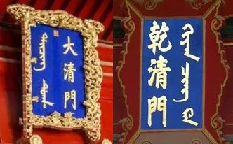 Dans les résidences des souverains Qing, on se faisait une obligation de doubler le chinois par du mandchou. Par exemple, sur la porte Daqingmen du Vieux Palais de Shenyang, se lisent les trois caractères chinois da qing men (大清门) et leur traduction mandchoue daicing duka (ᡩᠠᡳᠴᡳᠩ ᡩᡠᡴᠠ) avec duka (ᡩᡠᡴᠠ) pour porte. Tandis que, sur la porte Qianqingmen de la Cité Interdite à Pékin, se voient les sinogrammes qian qing men (乾清门) et leur prononciation giyan cing men (ᡤᡳᠶᠠᠨ ᠴᡳᠩ ᠮᡝᠨ) transcrite en alphabet mandchou, sans effort de traduction.