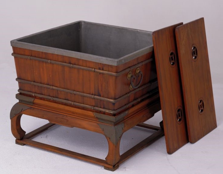 Glacière portative de l’époque Qing en pin avec pieds, poignées et couvercle à deux volets, revêtement intérieur en plomb faisant office d’isolant thermique. Musée du Vieux Palais de Pékin.