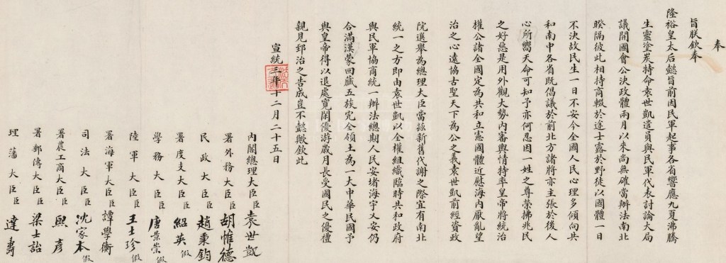 Sun Yat-sen proclama la République de Chine le 1er janvier 1912 à Nankin. Yuan Shikai en devint le premier président. Le 12 février, l’impératrice douairière Longyu signa l’acte de cession du pouvoir de l’empereur Xuantong, son neveu Puyi qui avait alors 6 ans. Il ne s’agissait pas d’une abdication puisque l’empereur conservait son titre, simplement renonçait-il à exercer un jour le pouvoir. Lui, et la famille impériale, se voyaient octroyer des privilèges : une rente conséquente et l’usage d’une partie de la «cour intérieure» de la Cité interdite, la zone résidentielle du palais par opposition à la «cour extérieure» anciennement dévolue à l’exercice du pouvoir. En fait, le dernier empereur et ses tantes y étaient assignés à résidence dans une cage dorée. L’ancien régent Zaifeng demeurait toujours au Palais des princes Chun.