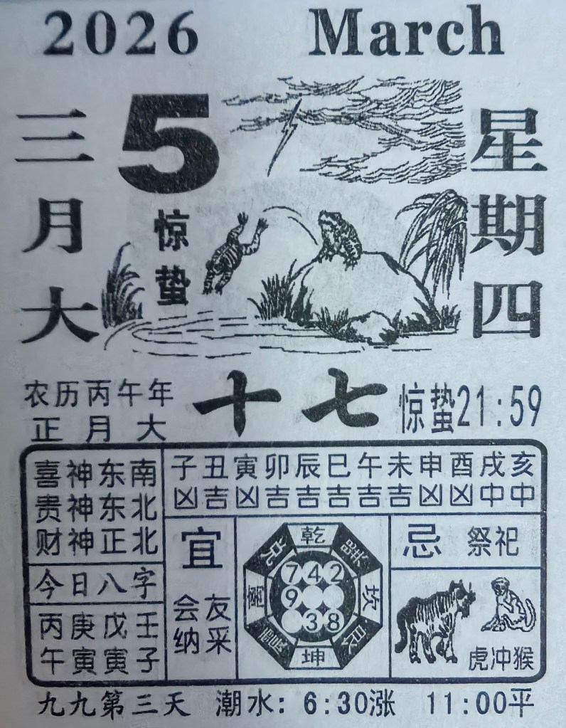 - Les périodes solaires du printemps chinois: d’abord le début du Printemps (立春) qui commence le 20 mars (à un jour près), puis se succèdent les pluies (雨水), la sortie de l’hibernation (惊蛰), l’équinoxe de printemps (春分), Qingming ou Pure clarté (清明), les pluies pour les grains (谷雨).