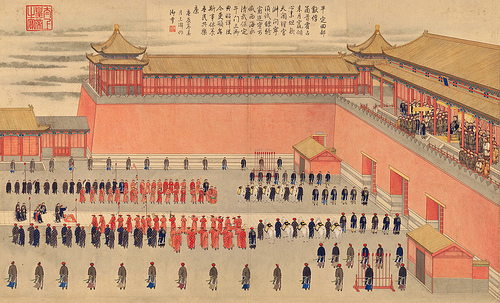 On y voit l’empereur Qianlong assis face au sud en haut du bâtiment central de la porte Wumen, une construction en forme de U inversé devant laquelle sont aujourd’hui installés les contrôles d’entrée du musée du vieux Palais de Pékin. En-bas, agenouillés face à l’empereur, des représentants de Dzoungarie font acte de reddition. Ils sont des Mongols oïrats établis dans le nord-ouest de la région que Qianlong allait nommer « Xinjiang » (la nouvelle frontière) en 1760.